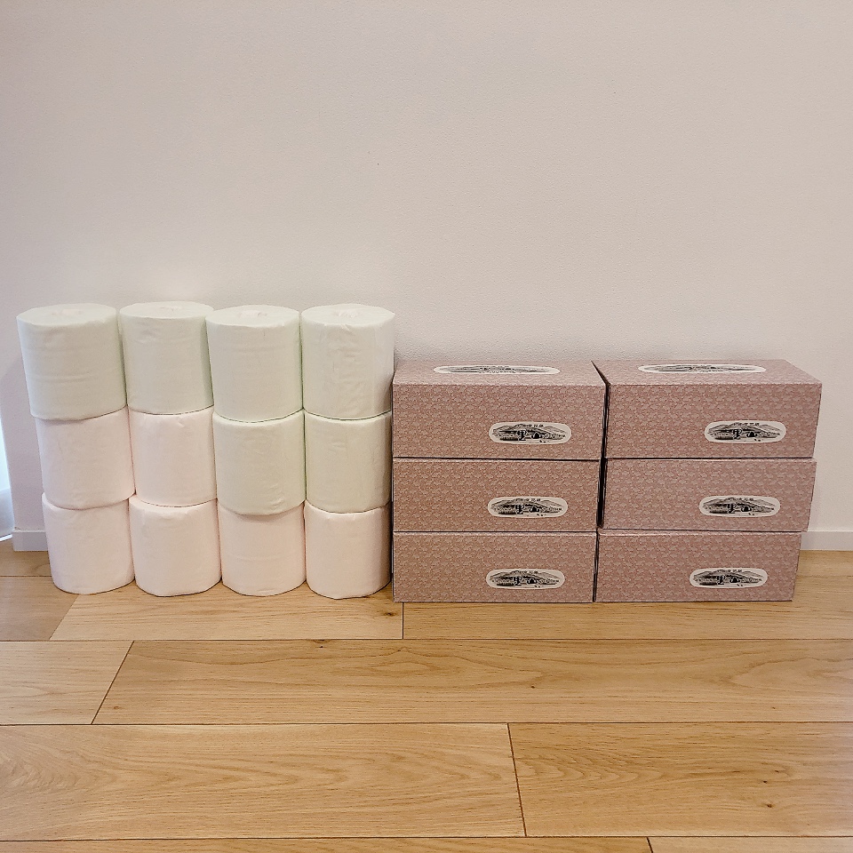 ダンボールいっぱいに大量のティッシュとトイレットペーパー!